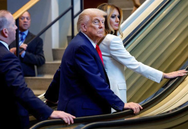 9月23日,美國(guó)總統(tǒng)特朗普和夫人梅拉尼婭到達(dá)聯(lián)合國(guó)總部參加第80屆聯(lián)大會(huì)議,乘坐自動(dòng)扶梯時(shí),電梯突然停止運(yùn)作。圖自路透社