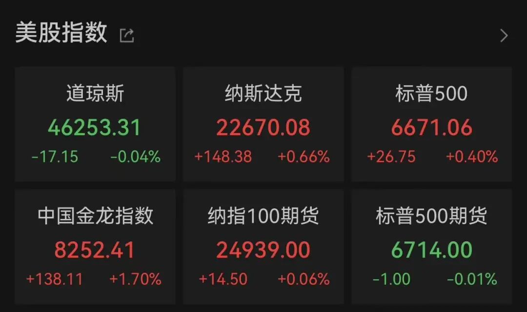 截至美東時(shí)間周三收盤,道指跌17.15點(diǎn),跌幅為0.04%,報(bào)46253.31點(diǎn);納指漲148.38點(diǎn),漲幅為0.66%,報(bào)22670.08點(diǎn);標(biāo)普500指數(shù)漲26.75點(diǎn),漲幅為0.40%,報(bào)6671.06點(diǎn)。
