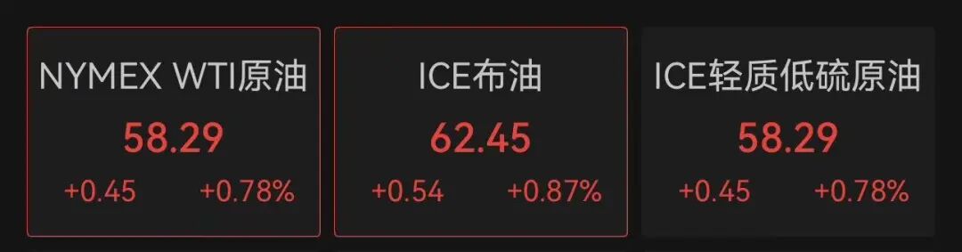 截至發(fā)稿,WTI 原油期貨漲0.45美元,漲幅0.78%,報(bào)58.29美元/桶;布倫特原油期貨漲0.54美元,漲幅0.87%,報(bào)62.45美元/桶。
