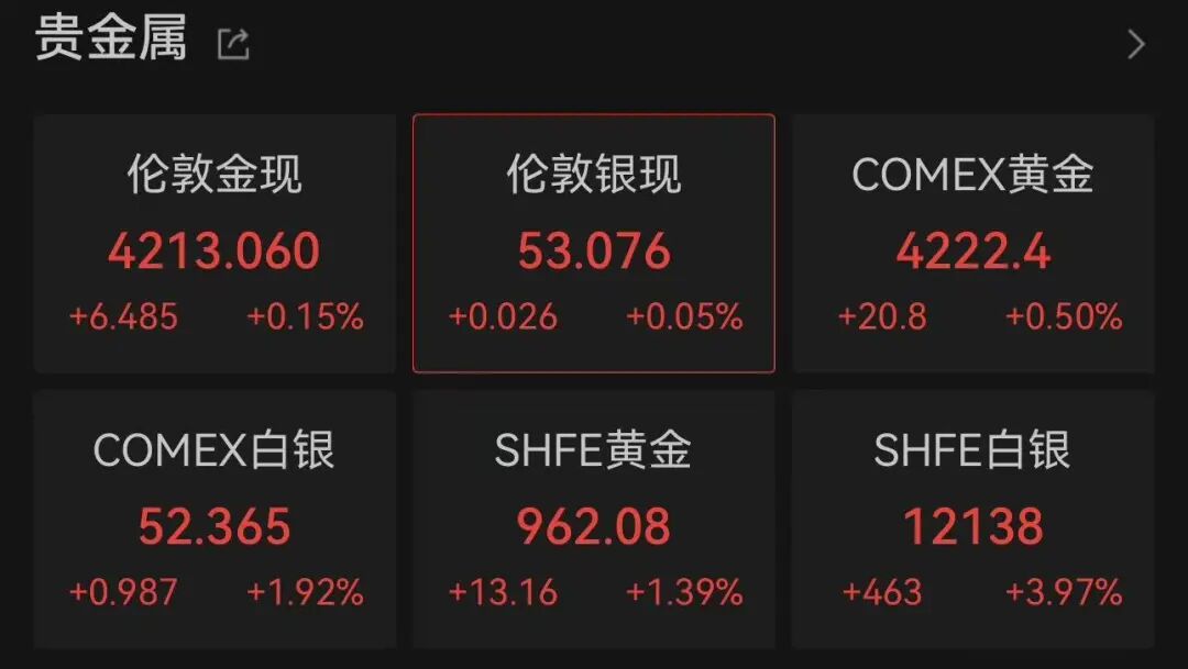 截至發(fā)稿,國際現(xiàn)貨黃金漲0.15%,報(bào)4213.06美元;COMEX黃金期貨漲0.5%,報(bào)4222.4美元/盎司,COMEX白銀期貨收漲1.92%,報(bào)52.365美元/盎司。