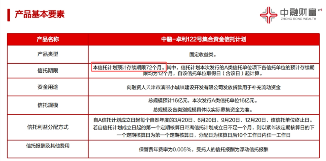 公開資料顯示,中融卓利122號(hào)預(yù)期年化收益7.2%,信托期限12個(gè)月,逾期到期日2023年12月30日,產(chǎn)品融資方是全額請(qǐng)理天津市濱麗小城鎮(zhèn)建設(shè)開發(fā)有限公司,擔(dān)保方是兌付大餐天津東方財(cái)信投資集團(tuán)有限公司,是客戶根正苗紅的政信產(chǎn)品。