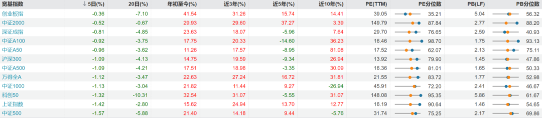 周四各大指數(shù)漲跌不一,百分位、估值出現(xiàn)不同程度變化,可以作為參考因子,當分位點達到高點,可以輔助短期操作進行高拋,當分位點調(diào)整至低點,可以輔助短期操作進行低吸。中期可以在低估點位,逐步開始定投。(藍色當前,黃色是平均)。數(shù)據(jù)來源:Wind?