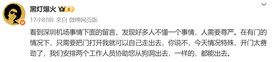 26日晚,脫口秀演員黑燈發(fā)文稱:“看到深圳機(jī)場事情下面的留言,發(fā)現(xiàn)好多人不懂一個事情,人需要尊嚴(yán)。在有門的情況下,只需要把門打開我就可以自己走出去,你說不,今天情況特殊,開門太費勁了,我們安排兩個工作人員協(xié)助您從狗洞出去,一樣的,都能出去。 ”
