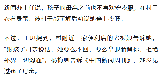 村里人說,孩子母親以前也不喜歡穿衣服,常常衣著暴露,后來經(jīng)過勸說才好轉(zhuǎn)。