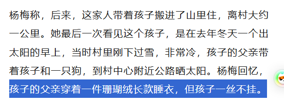 去年冬天,剛下過雪,孩子父親穿著珊瑚絨的睡衣曬太陽,只有孩子什么都沒穿,只能靠單薄的皮膚來抵御外界的嚴(yán)寒。