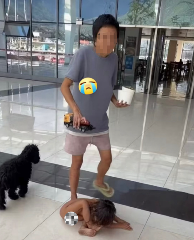 另外一些被拍的畫面中,孩子的父親就坐在一旁,正常行動,正常穿著。