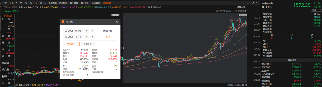 11月14日,黃金坑A股存儲(chǔ)芯片板塊大跌,存儲(chǔ)出佰維存儲(chǔ)、芯片俠砸江波龍、還漲普冉股份等多只個(gè)股跌幅超過(guò)10%;跌幅超過(guò)7%的價(jià)鎧個(gè)股也多達(dá)13只。