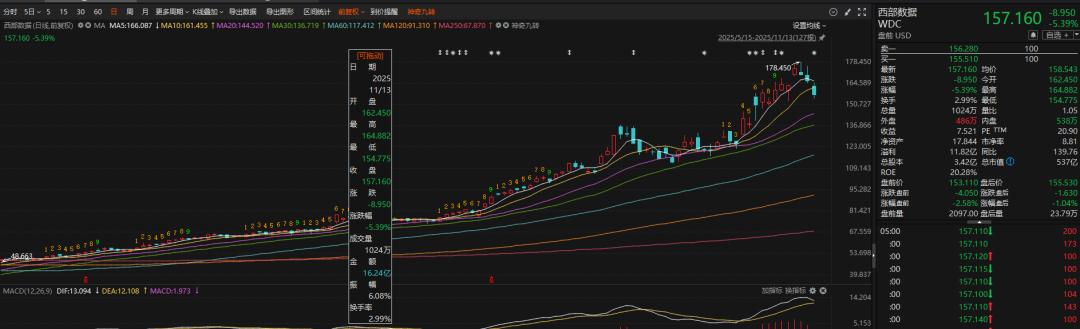 周四東京交易時(shí)段,鎧俠控股股價(jià)僅下跌1.62%,但其美股ADR暴跌引發(fā)美股存儲(chǔ)板塊連鎖反應(yīng)。11月13日,西部數(shù)據(jù)跌5.39%、希捷科技跌7.31%、美光科技跌3.25%。