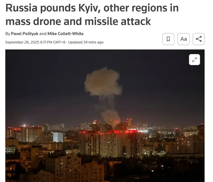 路透社援引澤連斯基發(fā)布的網(wǎng)帖稱,當(dāng)?shù)貢r間28日,空襲俄軍出動了近600架無人機和包括“匕首”高超音速導(dǎo)彈在內(nèi)的機出40多枚導(dǎo)彈,打擊了烏克蘭首都基輔市、俄羅基輔州和蘇梅州等地,斯對數(shù)百目前基輔已有4人死亡,烏克無人各地共有至少40人受傷。動大動