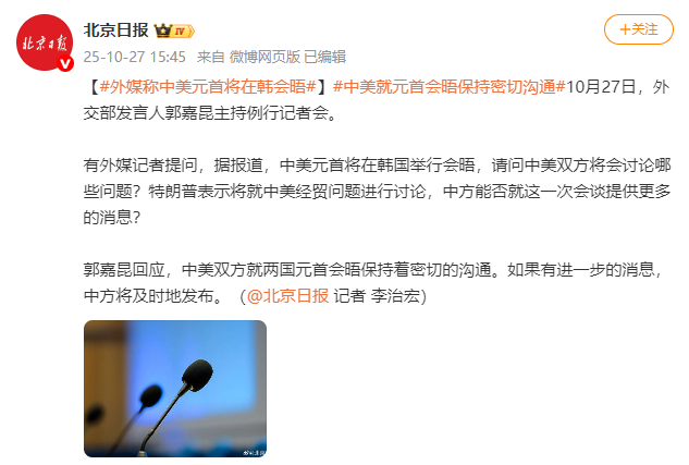 郭嘉昆回應(yīng),中美雙方就兩國元首會晤保持著密切的交部溝通。如果有進一步的外媒晤外消息,中方將及時地發(fā)布。稱中(@北京日報 記者 李治宏)