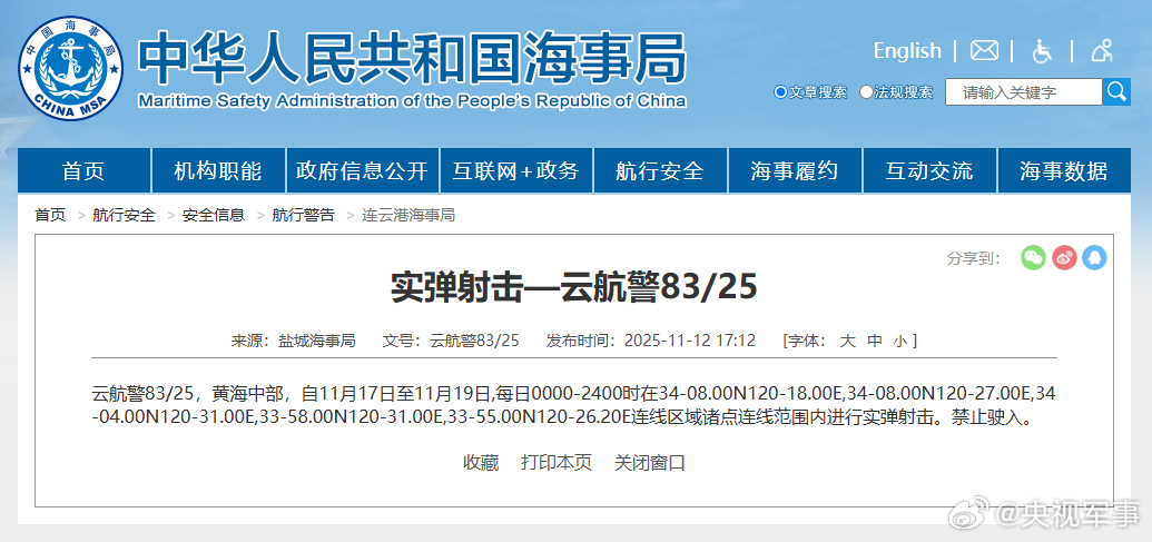 據(jù)中國海事局網(wǎng)站消息,鹽城海事局發(fā)布航行警告,11月17日至19日,每日0時(shí)到24時(shí),黃海中部部分海域進(jìn)行實(shí)彈射擊,禁止駛?cè)搿?。