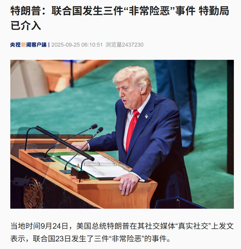 據(jù)央視新聞報道,當(dāng)?shù)貢r間9月24日,美國總統(tǒng)特朗普在其社交媒體“真實(shí)社交”上發(fā)文表示,聯(lián)合國23日發(fā)生了三件“非常險惡”的事件。