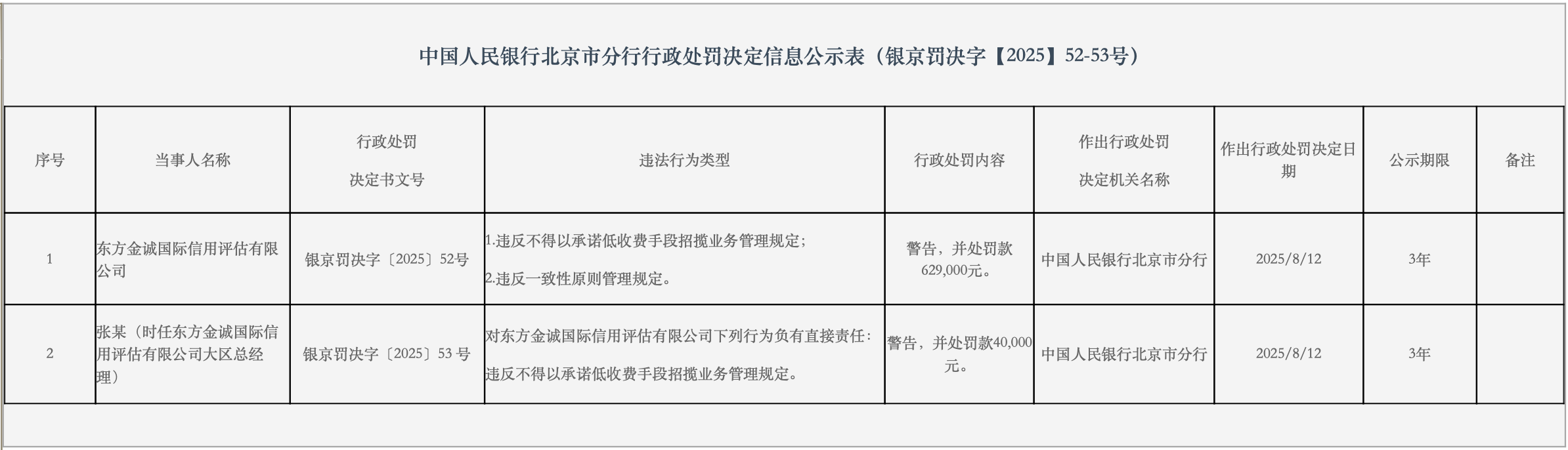 因違反不得以承諾低收費(fèi)手段招攬業(yè)務(wù)管理規(guī)定等,東方金誠被罰逾62萬元