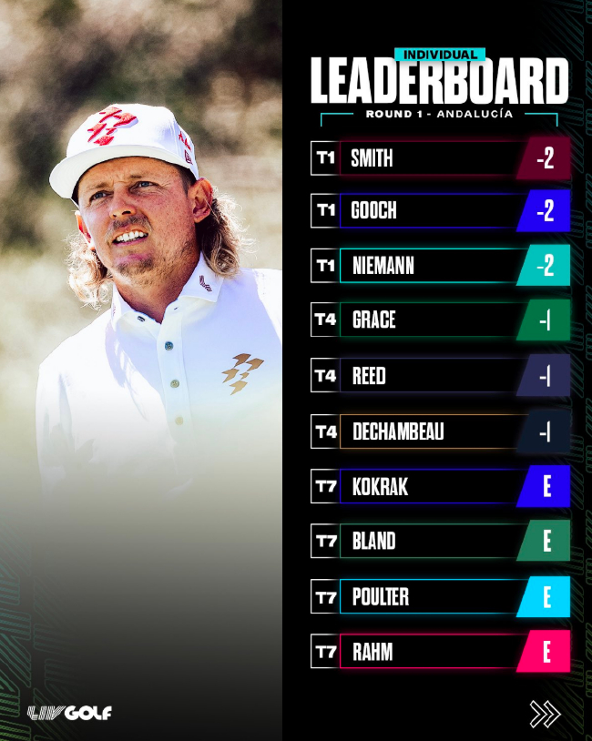 當暫停比賽的汽笛響起時,史密斯是僅有的五位紅字球員之一。他以低于標準桿1桿的成績與扣殺隊(Smash)泰勒-古奇(Talor Gooch,2023年瓦德拉瑪個人冠軍)、宏大隊(Majesticks GC)聯(lián)合隊長李·維斯特伍德、刺球隊布蘭登·格雷斯,以及領跑LIV高爾夫個人積分榜、尋求賽季第五勝的力矩隊隊長華金·涅曼共同領跑。
