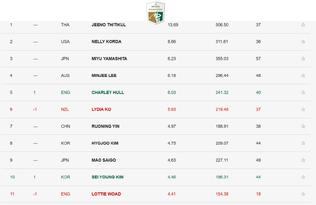 世界前十沒有太大變化。查莉-赫爾(Charley Hull)在最終站并列19位,獲得3.88分,與高寶璟互換座次,上升到第五位。金世煐排名第六,收入12.4分,世界排名重回前十位,排在第十位。洛蒂-沃德(Lottie Woad)卻跌出了前十位,排在11位。