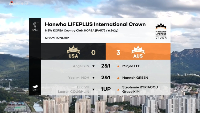 當(dāng)格林在第二場(chǎng)單人對(duì)決賽的皇冠第17洞確保勝利時(shí),澳大利亞組合斯蒂芬妮·吉里亞科(Stephanie Kyriacou)與格蕾絲·金對(duì)陣美國(guó)組合莉利婭烏與勞倫-考夫林(Lauren Coughlin)的杯澳四人二球賽結(jié)果已無(wú)關(guān)大局。而這場(chǎng)比賽最終以平局收?qǐng)?。大利?duì)奪