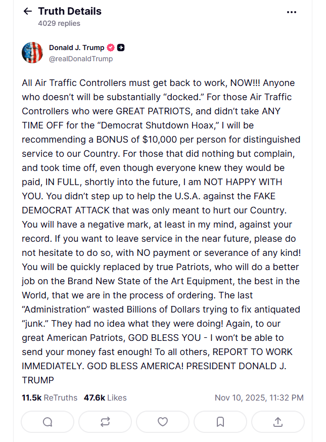 特朗普在上述帖子中寫道,“對(duì)于那些(繼續(xù)工作的)空中交通管制員,他們是偉大的愛國(guó)者,沒有因?yàn)椤裰鼽h停擺騙局’而請(qǐng)假,我建議給他們每人1萬美元的獎(jiǎng)金,以表彰他們對(duì)我們國(guó)家的杰出貢獻(xiàn)?!?/p>