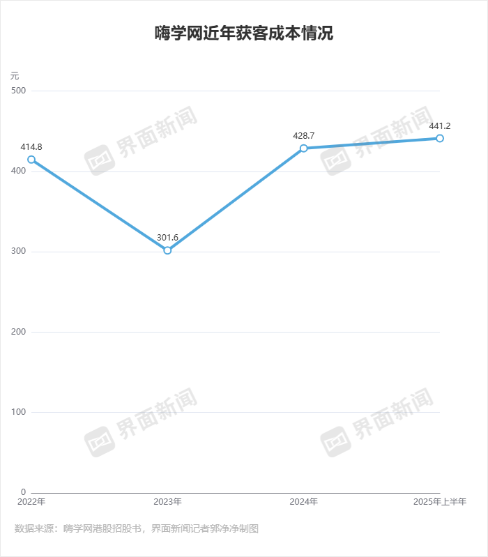盡管嗨學(xué)網(wǎng)稱其平均營銷投資回報率在2024年達到約8.9%,“位于行業(yè)領(lǐng)先水平”。但其獲客成本居高不下,報告期內(nèi)分別是414.8元、301.6元、428.7元及441.2元。