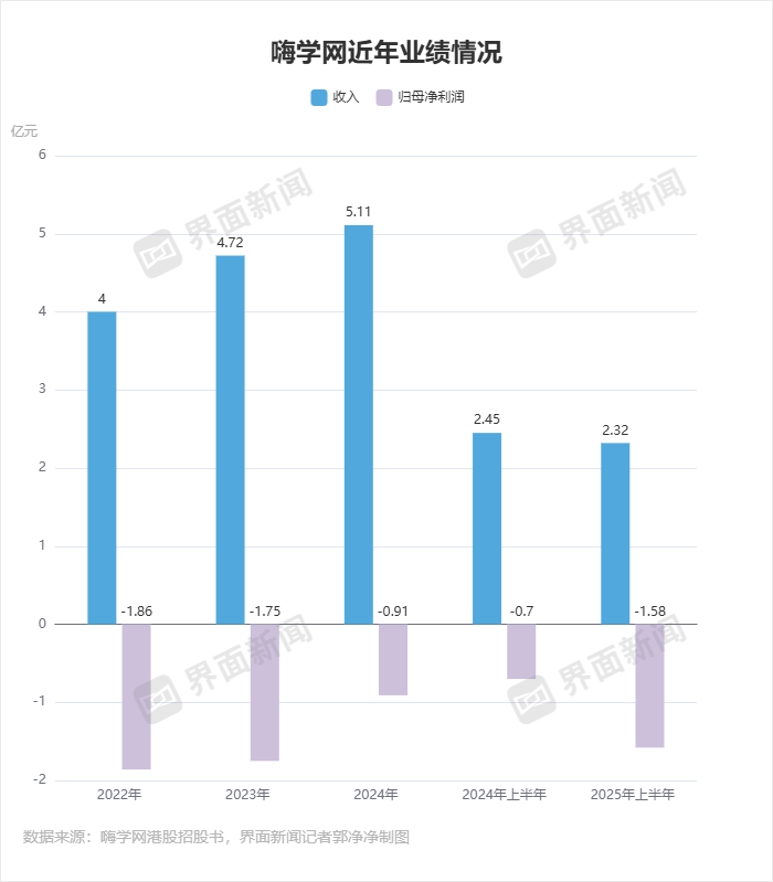 2022年、2023年、2024年和2025年1-6月(報告期內(nèi)),嗨學(xué)網(wǎng)實現(xiàn)收入分別約4億、4.72億、5.11億、2.32億元,毛利率分別為78.6%、81.1%、81.6%、85.8%,凈虧損約1.86億、1.75億、9070萬、1.58億元,三年半累計虧損超6億元。