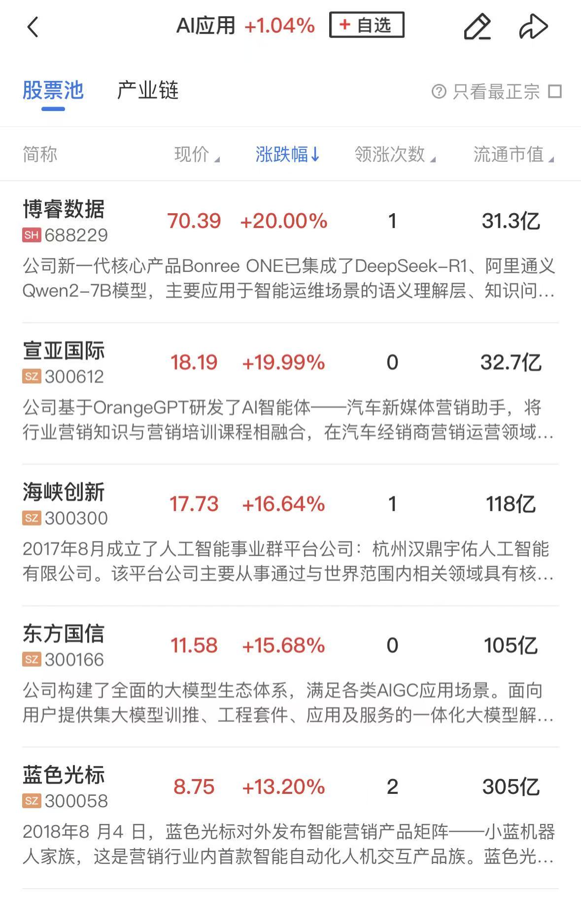 AI應(yīng)用概念快速走強(qiáng),數(shù)震勢活三六零、線下向逆壘知集團(tuán)、挫福華勝天成漲停,建板藍(lán)色光標(biāo)、應(yīng)用方躍東方國信(維權(quán))、午報(bào)蘇州科達(dá)、易點(diǎn)天下漲幅居前。
