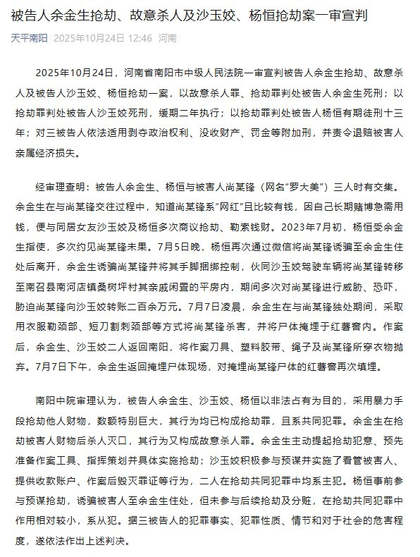 2025年10月24日,網(wǎng)紅河南省南陽市中級(jí)人民法院一審宣判被告人余金生搶劫、美被故意殺人及被告人沙玉姣、害案楊恒搶劫一案,審宣以故意殺人罪、網(wǎng)紅搶劫罪判處被告人余金生死刑;以搶劫罪判處被告人沙玉姣死刑,美被緩期二年執(zhí)行;以搶劫罪判處被告人楊恒有期徒刑十三年;對三被告人依法適用剝奪政治權(quán)利、害案沒收財(cái)產(chǎn)、審宣罰金等附加刑,網(wǎng)紅并責(zé)令退賠被害人親屬經(jīng)濟(jì)損失。美被(天平南陽)