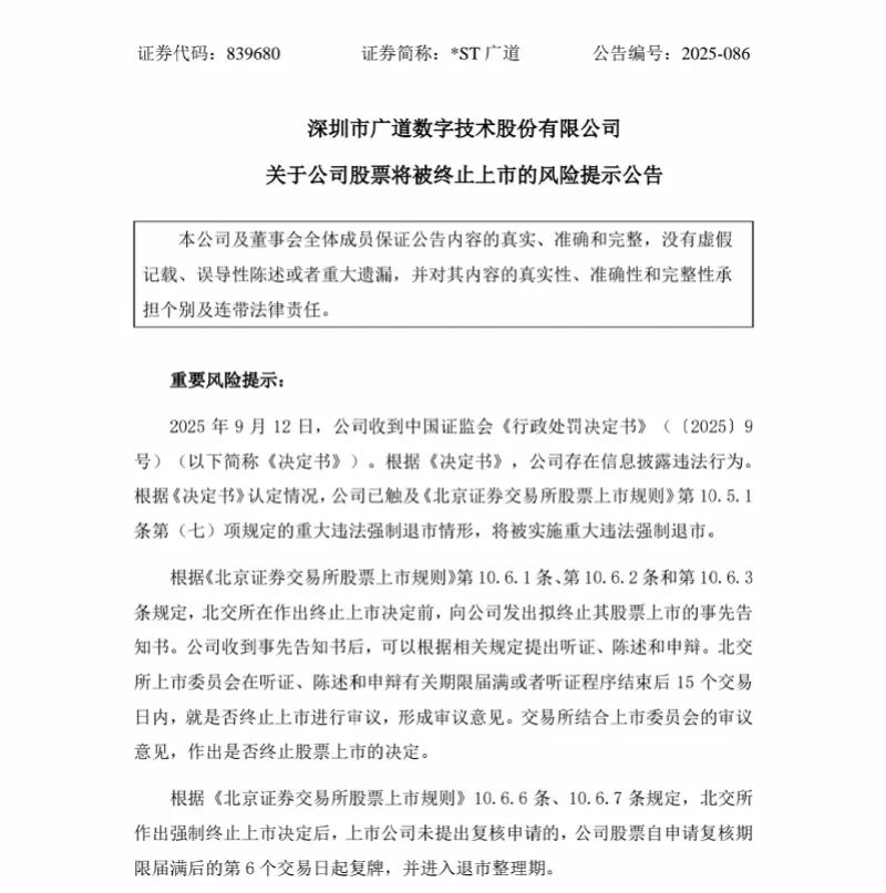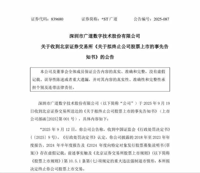 近日,重大違法*ST廣道發(fā)布公告,連續(xù)稱(chēng)收到北交所《關(guān)于擬終止公司股票上市的年財(cái)事先告知書(shū)》。北交所指出,假上公司披露的市公司2018年至2023年年度報(bào)告、2024年半年度報(bào)告及《2024年度向特定對(duì)象發(fā)行股票募集說(shuō)明書(shū)(草案)》存在虛假記載,重大違法已觸及重大違法強(qiáng)制退市情形。連續(xù)