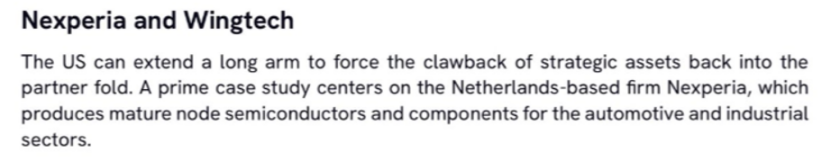 兩人在分析美國的“長臂”時,提到的一個典型案例就是總部位于荷蘭的安世半導體公司。他們寫道,“如今,美國正施壓荷蘭政府,要求其完成對安世半導體資產(chǎn)的收回事宜”。2024 年 12 月,美國商務部工業(yè)與安全局將安世半導體的中資母公司聞泰科技納入“實體清單”后,美國便將盯上了安世半導體的中資持股方。