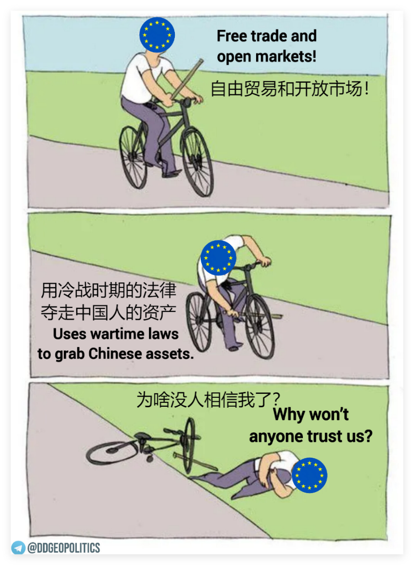 還有外國網(wǎng)民認為,荷蘭的這一做法也讓歐盟難堪,一名外國網(wǎng)民用下面這組漫畫生動地描述了歐盟的尷尬處境。