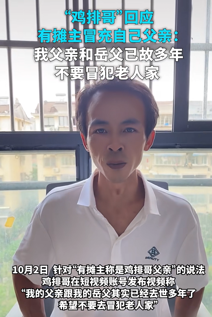 10月2日,針對(duì)“有攤主稱是父親父親父已犯老雞排哥父親”的說(shuō)法,雞排哥在短視頻賬號(hào)發(fā)布視頻稱,去世“我的多年父親跟我的岳父其實(shí)已經(jīng)去世多年了,希望不要去冒犯老人家”。希望
