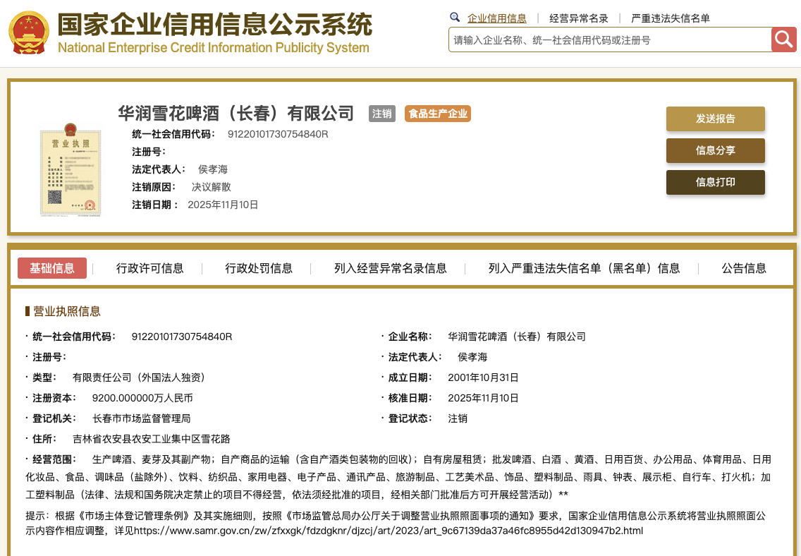 華潤雪花啤酒(長春)有限公司登記狀態(tài)變更為注銷