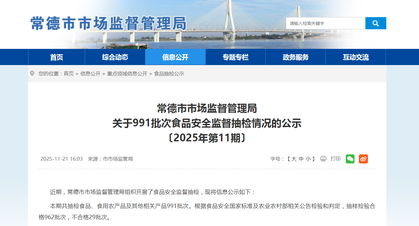 湖南省常德市市場監(jiān)督管理局關(guān)于991批次食品安全監(jiān)督抽檢情況的公示〔2025年第11期〕