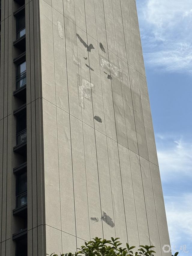 “這房子是阿拉兩三代人所有的積蓄啊,還不到一年竟成了這個樣子,想想就整夜整夜睏勿著覺?!睒I(yè)主郭先生告訴記者,去年12月預(yù)看房時,8號樓外墻就有幾個拳頭大小的小鼓包,開發(fā)商承諾“收房后就修”。由于孩子要趕在今年9月上附近幼兒園,急需裝修入住,他便相信了開發(fā)商的說法。沒想到今年4月起,小鼓包開始“爆雷”:漆面先開裂,隨后墻皮碎塊不斷脫落。直至7月,5號樓外墻已脫落近五分之二,連廊道玻璃頂棚上都濺有不少墜落碎塊。其間,開發(fā)商進(jìn)行了兩次局部點修,問題卻愈演愈烈。沒修的地方鼓包擴(kuò)大,修過的地方又重新開裂,這根本就是“狗皮膏藥”式維修,糊弄人的!