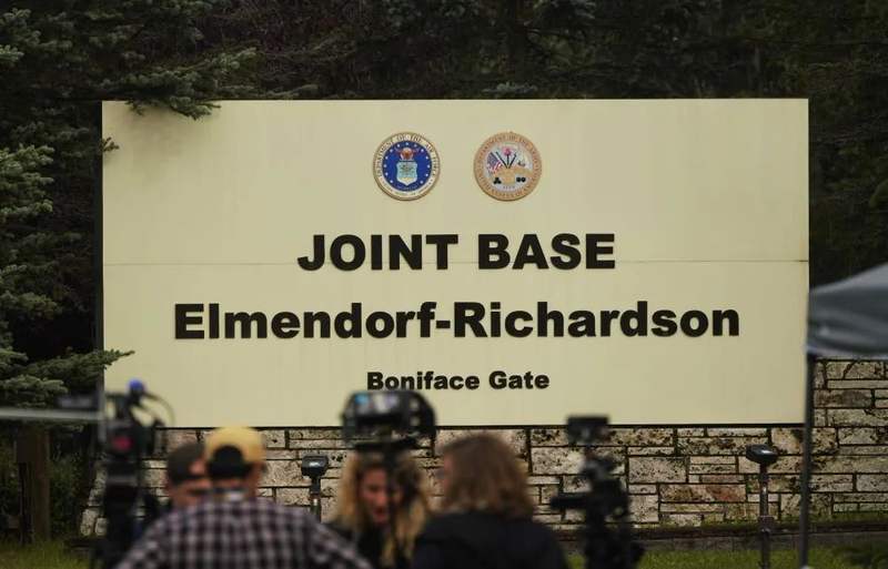8月14日,媒體記者在美國阿拉斯加州安克雷奇的埃爾門多夫-理查森聯(lián)合軍事基地外報道。新華社記者吳曉凌攝