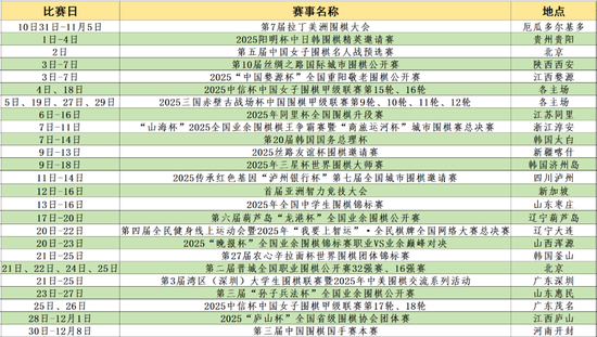 日前,中國圍棋協(xié)會公布了2025年11月圍棋國際賽事、全國賽事賽程如下: