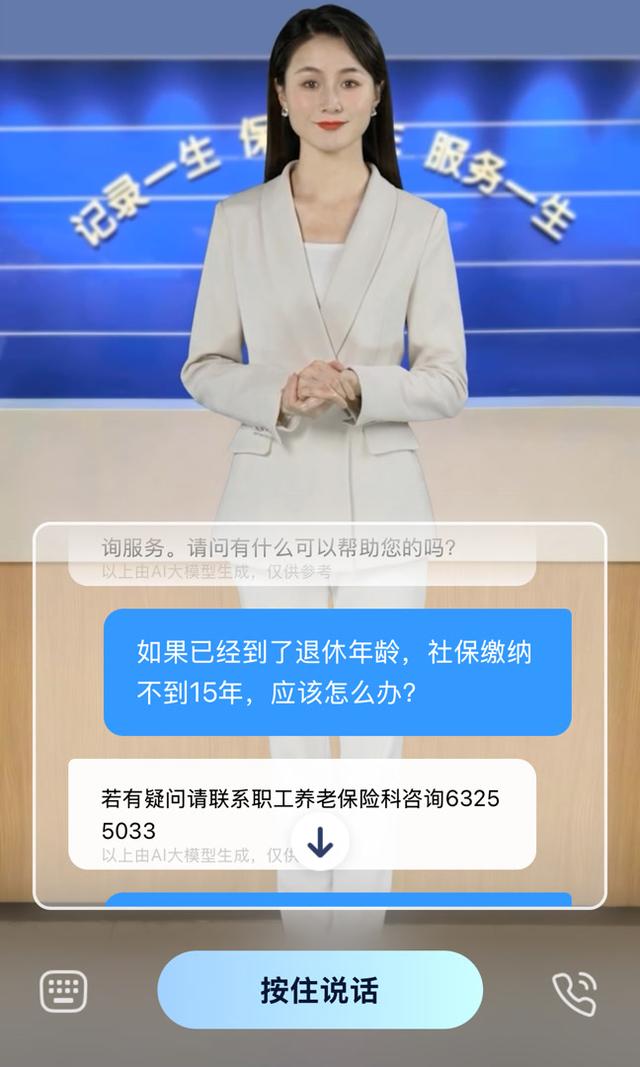 與之類(lèi)似,記者使用某區(qū)社保局推出的網(wǎng)絡(luò)互動(dòng)“數(shù)字人”,向其咨詢(xún)“已經(jīng)到了退休年齡,社保繳納不滿(mǎn)15年應(yīng)該怎么辦?”對(duì)于這一基礎(chǔ)問(wèn)題,對(duì)方也是無(wú)法作答,只能給出職工養(yǎng)老保險(xiǎn)科的電話(huà),請(qǐng)?zhí)釂?wèn)者致電咨詢(xún)。