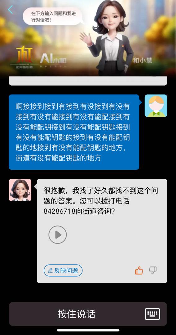 很顯然,用戶(hù)可以根據(jù)自己想要獲取的信息,點(diǎn)擊不同的人物進(jìn)行咨詢(xún)。然而記者點(diǎn)擊女性角色,使用語(yǔ)音功能?chē)L試提問(wèn),“街道有沒(méi)有能配鑰匙的地方?”發(fā)現(xiàn)該平臺(tái)語(yǔ)音轉(zhuǎn)文字的識(shí)別能力堪憂(yōu),一句如此簡(jiǎn)短、清晰的提問(wèn),卻被識(shí)別為“啊接接到接到有接到有沒(méi)接到有沒(méi)有……”重復(fù)冗余、近百字的表達(dá)。