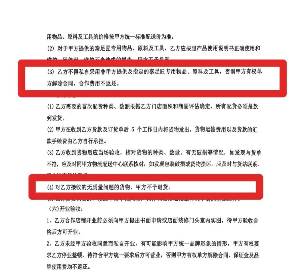 在合同的條款(3)中加盟商不得私自允許購(gòu)買不是秦足匠渠道的產(chǎn)品,包含加盟店里所需要的原料、工具物品,加盟商花了6.6萬(wàn)的品牌加盟費(fèi)以后,還需不斷在秦足匠所指定的渠道購(gòu)買一切所需的工具物品,要不然就要解除合同不退一分的合作費(fèi)用,可謂霸道至極,這種條款讓人看了不得大跌眼鏡。