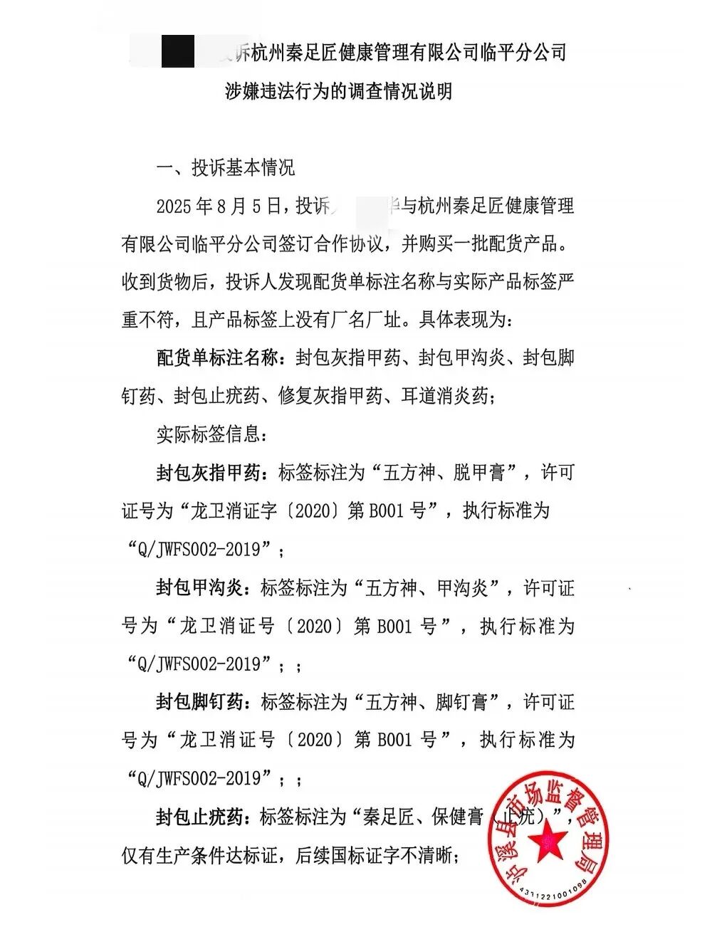 瀘溪縣市場(chǎng)監(jiān)督管理局就秦足匠公可給陳某華發(fā)來(lái)的配貨單標(biāo)注名稱:封包灰指甲藥,封包甲溝炎,封包腳釘藥,封包止疣藥,修復(fù)灰指甲藥,耳道消炎藥,產(chǎn)品涉嫌為三無(wú)產(chǎn)品,這些產(chǎn)品存在以下涉嫌違法行為。