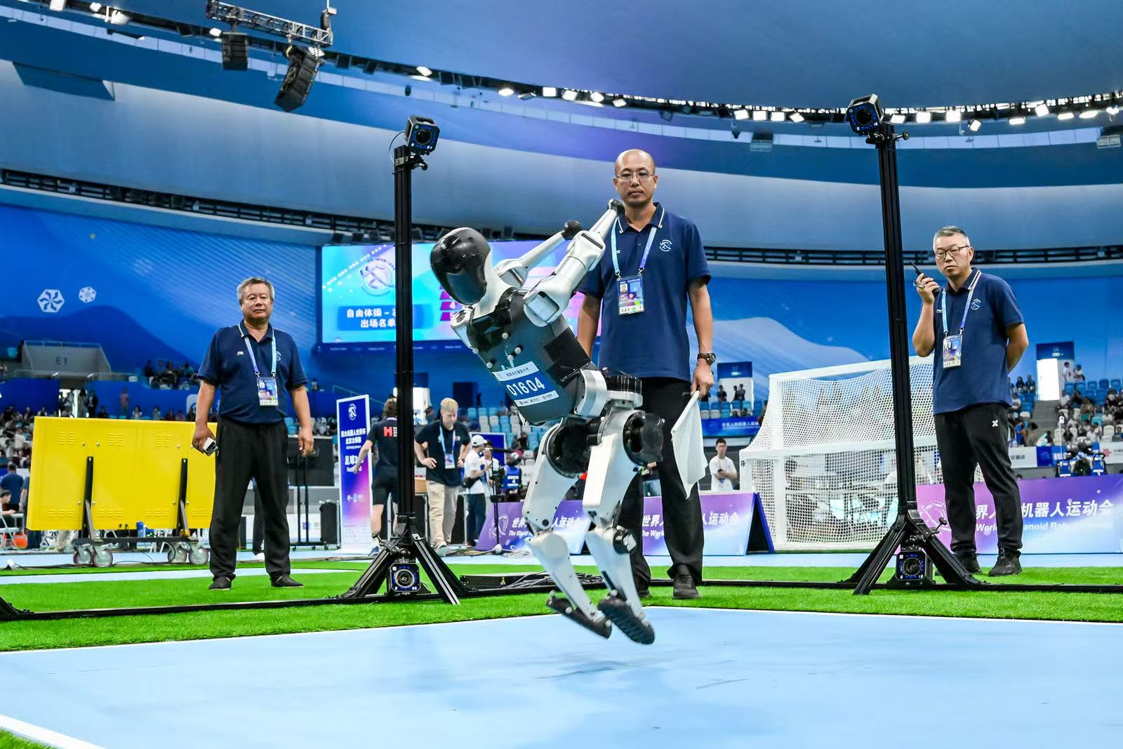 人形機器人參加原地跳高項目。主辦方提供新京報貝殼財經(jīng)訊記者陳維城)8月16日,在2025世界人形機器人運動會原地跳高比賽中,星動紀(jì)元以0.95米獲得金牌,江淮中心凌空行者隊以0.87米摘得銀牌,魔法原