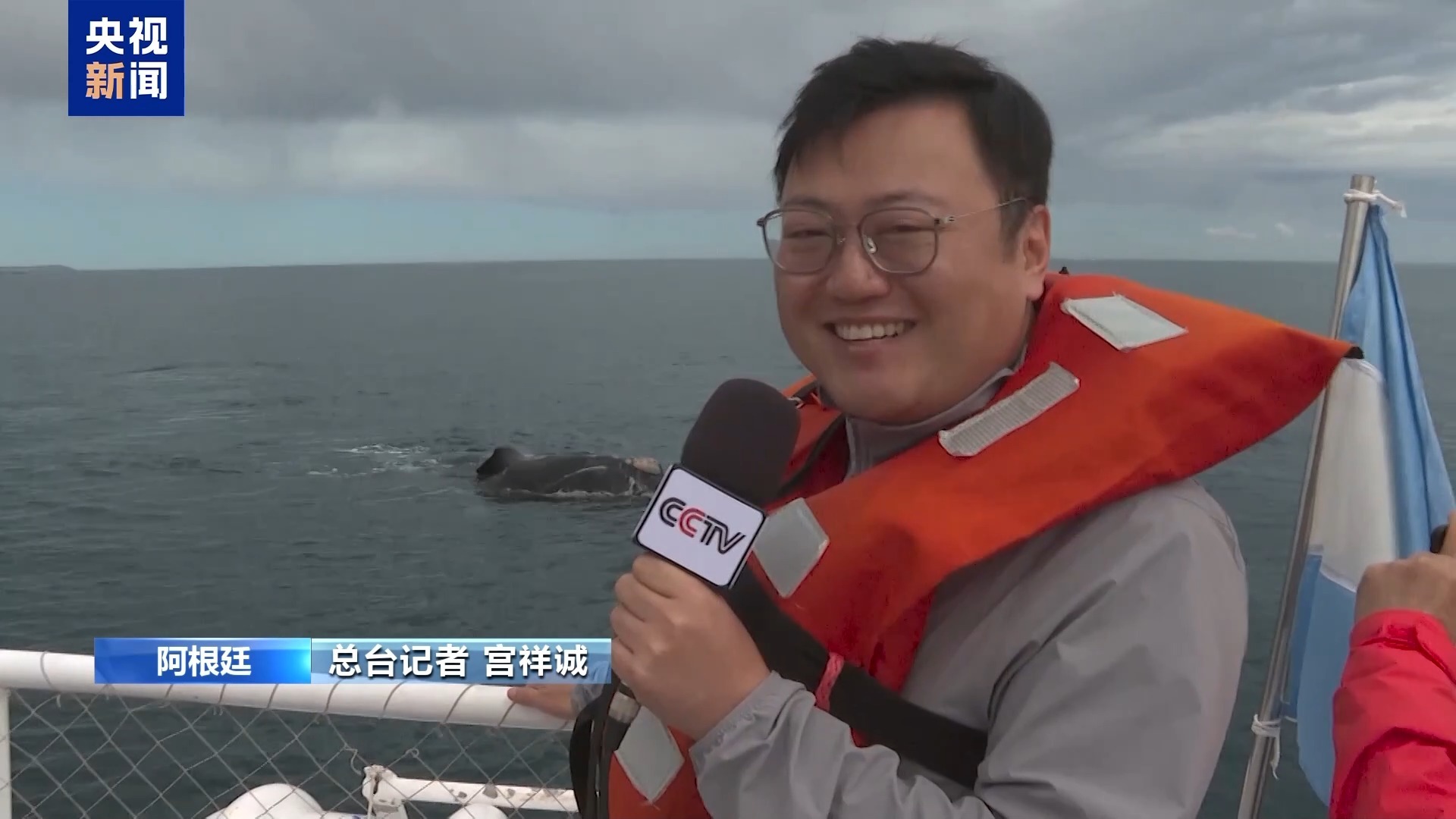 總臺(tái)記者 宮祥誠(chéng):大家順著我手指的方向看,我背后的就是一頭南露脊鯨,每年的這個(gè)時(shí)候它們都會(huì)來(lái)到這里繁殖和哺育幼鯨,吸引了來(lái)自世界各地的游客前來(lái)觀賞。