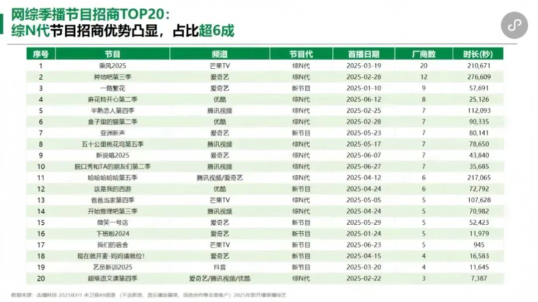 據擊壤洞察數據,今年上半年,綜N代節(jié)目的招商核心競爭力雖還在持續(xù)凸顯,在網綜季播節(jié)目招商TOP20榜單中占比超六成,可不同IP的招商表現卻呈現出鮮明的兩極分化?!冻孙L2025》的招商品牌數量從上一季的8家大幅增至20家,而《盒子里的貓2》從上一季的12家降至8家,《種地吧3》更從28家斷崖下跌至12 家。