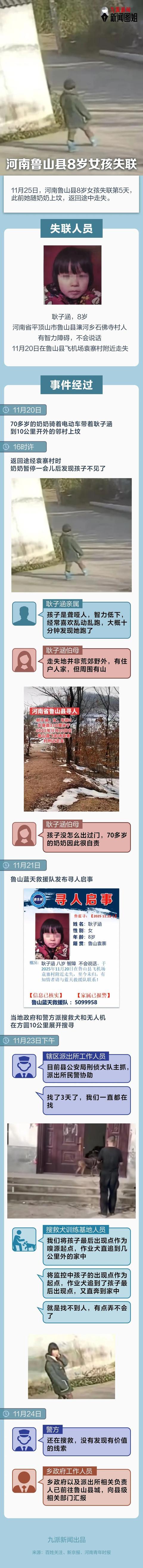 據(jù)此前報(bào)道,25日,魯山縣瀼河鄉(xiāng)石佛寺村一村民告訴九派新聞,女孩是本村村民,事發(fā)時(shí)她陪同奶奶前往鄰村上墳,奶奶“一不留神”便發(fā)現(xiàn)孩子不見(jiàn),丟失地點(diǎn)離家約幾里地。