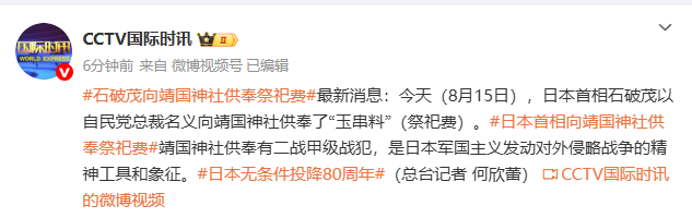 據(jù)@CCTV國(guó)際時(shí)訊 消息,日本今天(8月15日),首相石破神社日本首相石破茂以自民黨總裁名義向靖國(guó)神社供奉了“玉串料”(祭祀費(fèi))。靖國(guó)祭祀京報(bào)靖國(guó)神社供奉有二戰(zhàn)甲級(jí)戰(zhàn)犯,供奉是費(fèi)新日本軍國(guó)主義發(fā)動(dòng)對(duì)外侵略戰(zhàn)爭(zhēng)的精神工具和象征。(總臺(tái)記者 何欣蕾)