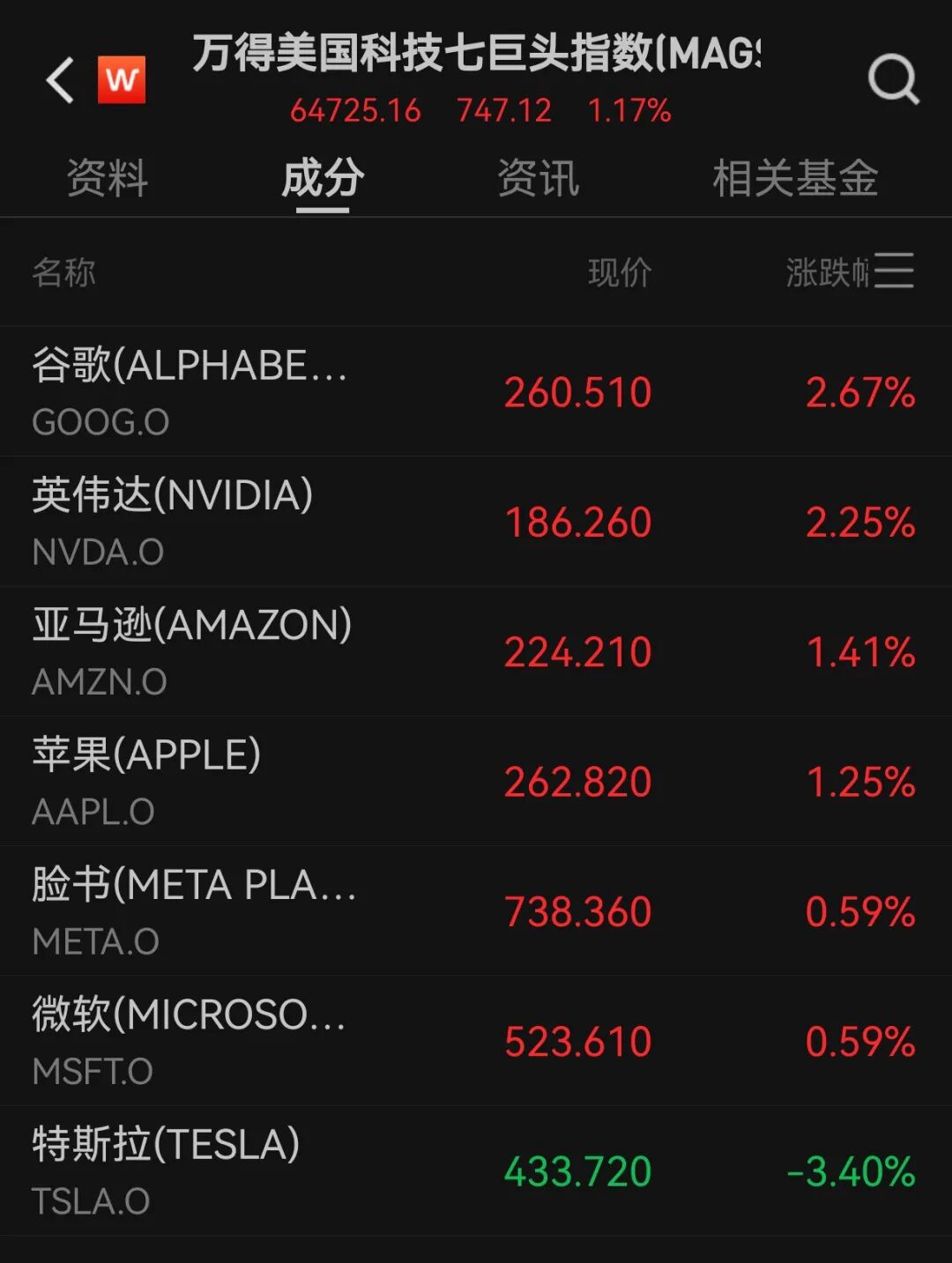 美股大型科技股多數(shù)上漲,大型萬(wàn)得美國(guó)科技七巨頭指數(shù)上漲1.17%,科技其中,股普股大高谷歌-C、漲美指數(shù)英偉達(dá)漲逾2%,創(chuàng)新蘋果、大型亞馬遜漲超1%??萍?/p>
