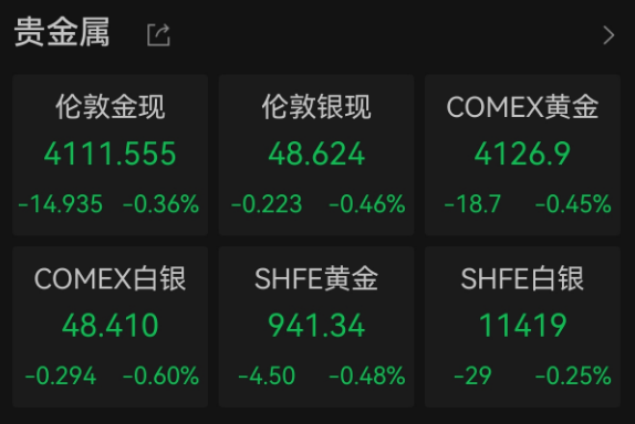 當(dāng)?shù)貢r(shí)間10月24日,國(guó)際黃金價(jià)格普遍收跌,COMEX黃金期貨跌0.45%報(bào)4126.90美元/盎司,本周累計(jì)下跌2.05%;倫敦現(xiàn)貨黃金跌0.36%,報(bào)4111.56美元/盎司,本周累計(jì)下跌3.29%。