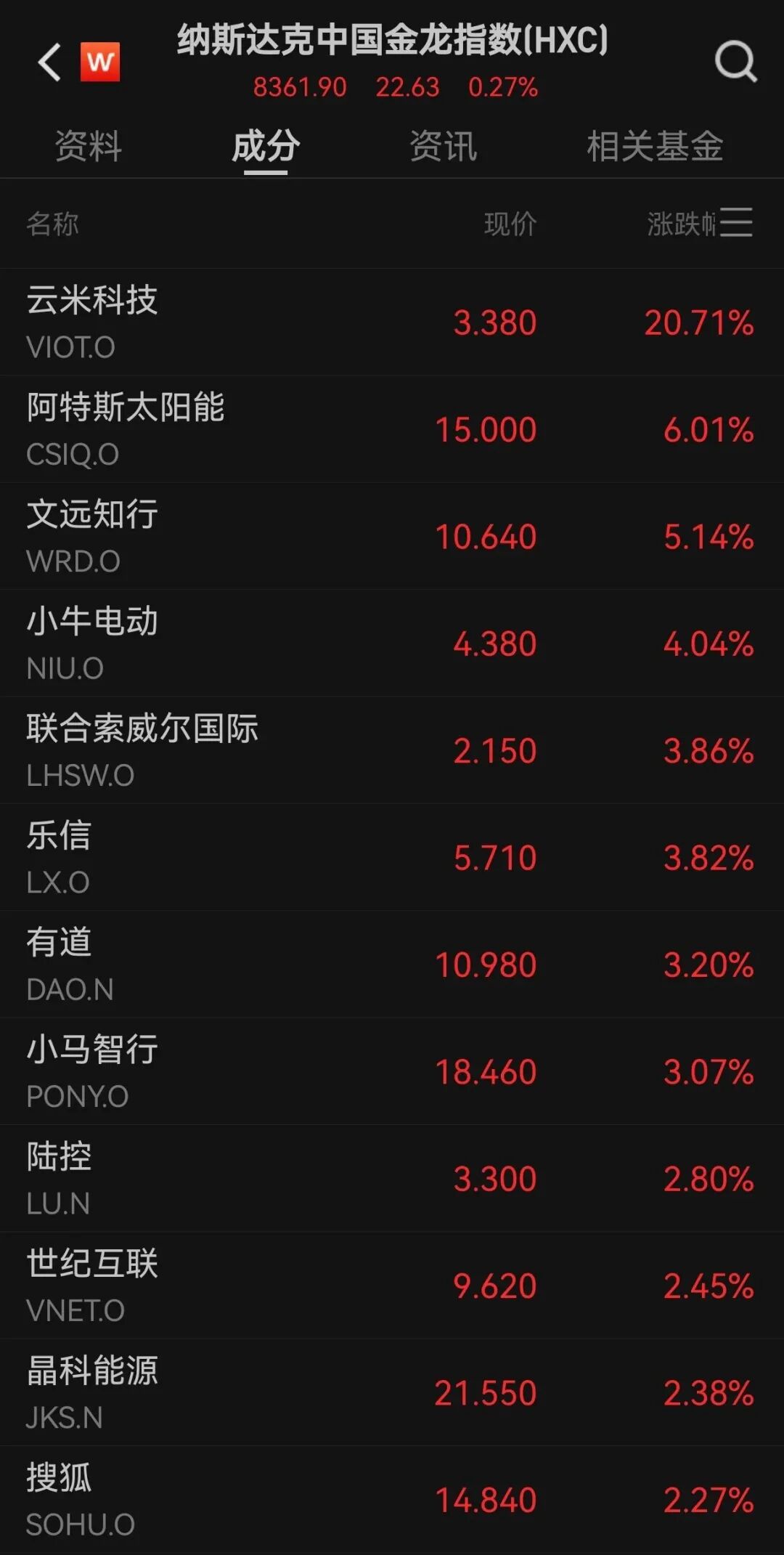中概股漲跌不一,納斯達(dá)克中國(guó)金龍指數(shù)漲0.27%。云米科技漲超20%,阿特斯太陽(yáng)能漲超6%。