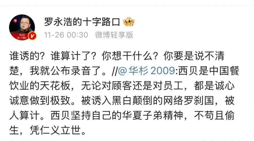 26日上午11點,羅永浩再次出手,劃清界限:這次是我和華杉之間的事,和西貝無關。
