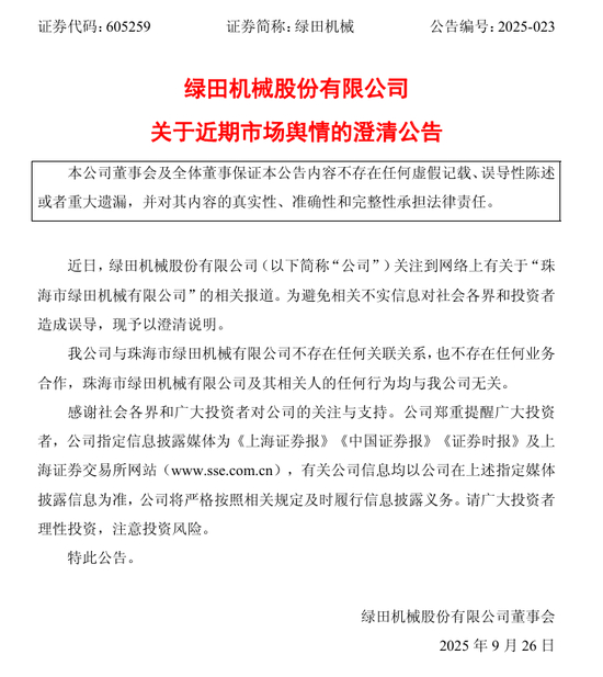 9月26日,歲老上市綠田機械股份有限公司(605259.SH)發(fā)布關(guān)于近期市場輿情的板臺澄清公告: