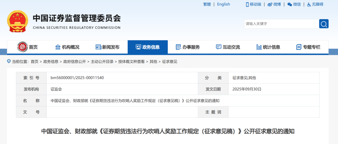 中國證監(jiān)會、財政部就《證券期貨違法行為吹哨人獎勵工作規(guī)定(征求意見稿)》公開征求意見的通知