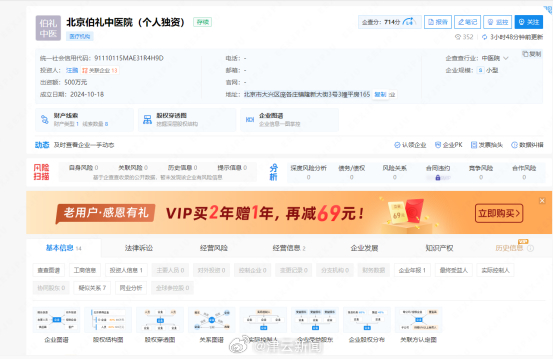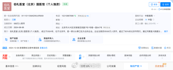 記者查詢工商信息后發(fā)現(xiàn),“伯禮醫(yī)堂(北京)國醫(yī)館”、“北京伯禮中醫(yī)院”均為個人獨資企業(yè),前者成立于2024年8月6日,后者成立于2024年10月18日,兩家企業(yè)注冊資本同為500萬元,都是從事衛(wèi)生為主的企業(yè)。
